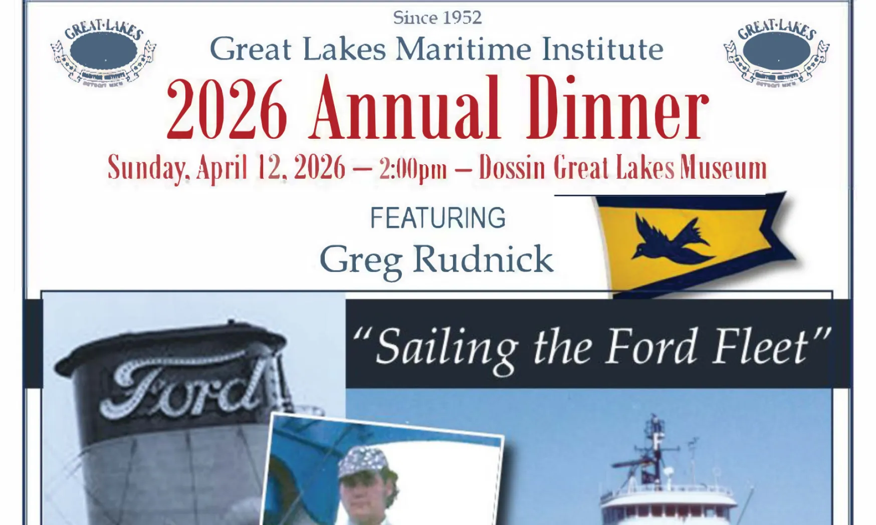 Support the Great Lakes Maritime Institute at their annual dinner at the Dossin Great Lakes Museum on Sunday, April 12! The afternoon will feature live and silent auctions and speaker Greg Rudnick presenting on his time sailing the Ford Fleet.
