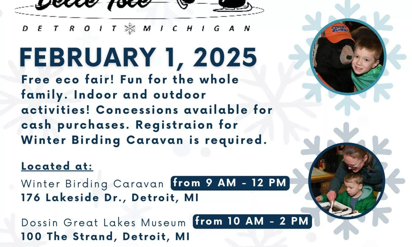 Visit the Shiver on the River eco fair! Friends of the Detroit River, in partnership with the Detroit Historical Society, will host the event inside the beautiful Dossin Great Lakes Museum from 10 A.M. to 2 P.M. The typical $5 admission fee to visit the museum will be waived during the event. Enjoy indoor and outdoor activities for the whole family! Concessions available for cash purchases.