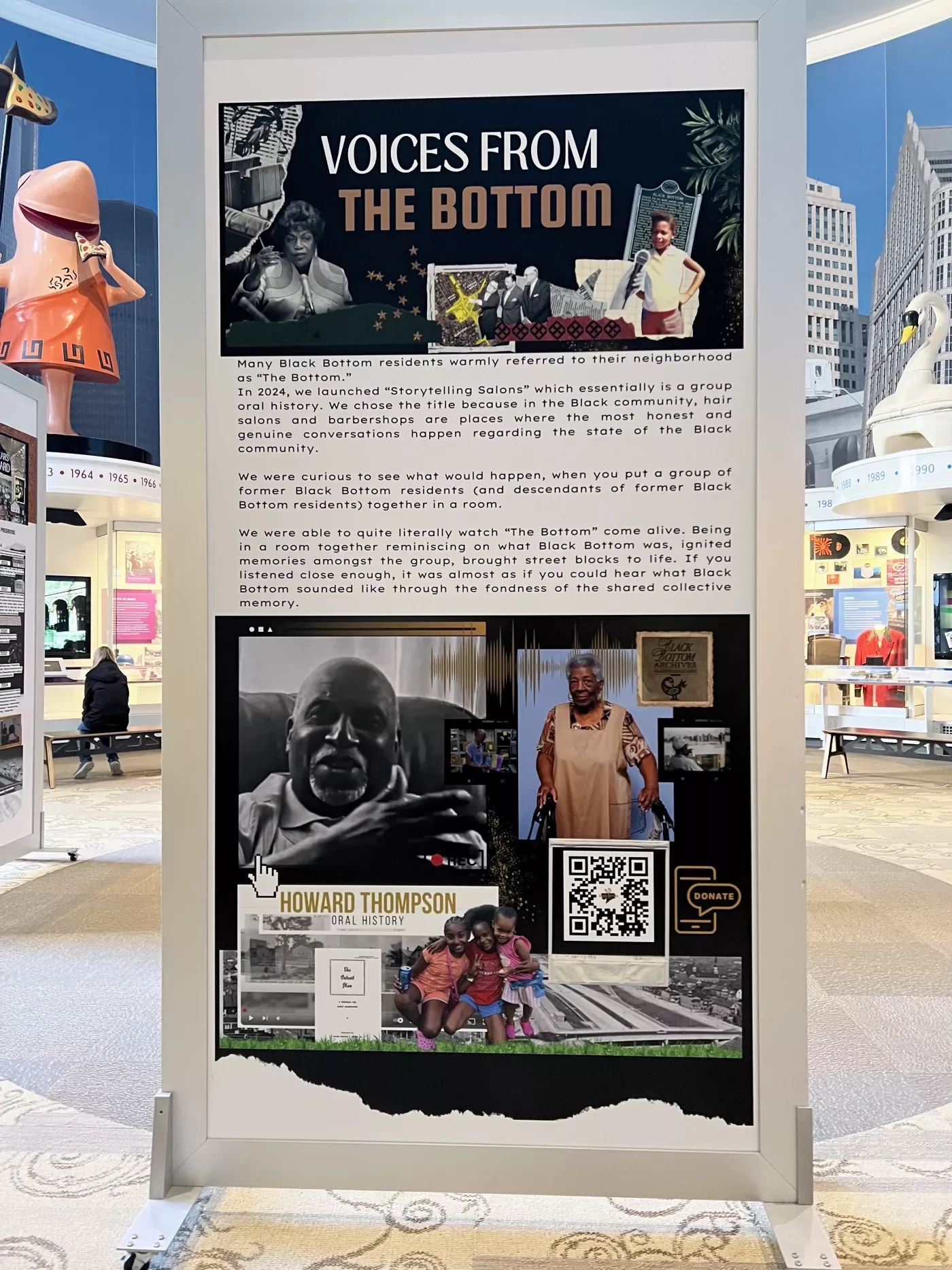 This immersive exhibition invites all to experience the collective remembrance and collective dreaming facilitated by the Sankofa Community Research Project, which for the past two years has been recording the stories of past residents, descendants, and community members about the harm inflicted by the destruction of Black Bottom and their hopes for the 30 acres of land to be created in the redevelopment of I-375.