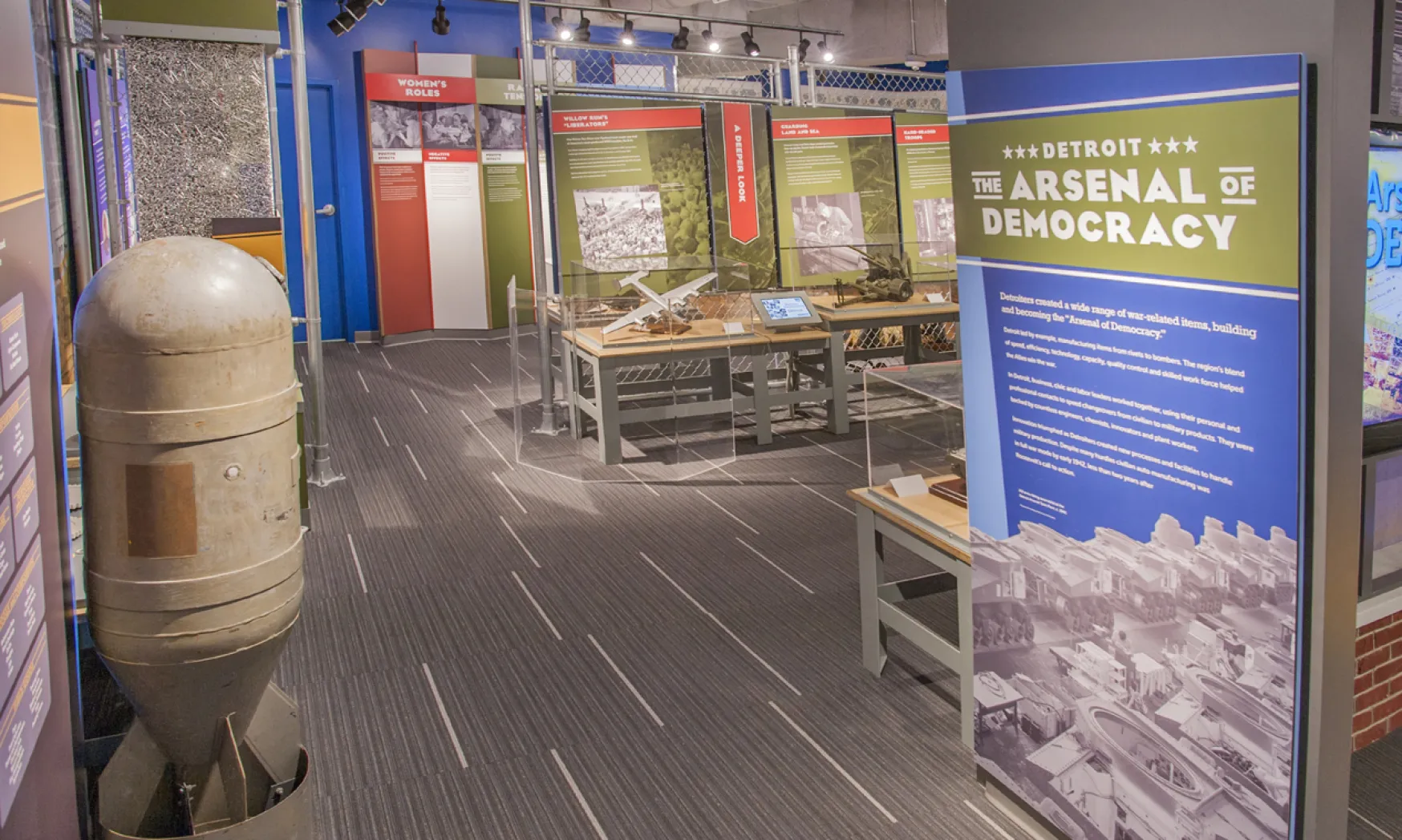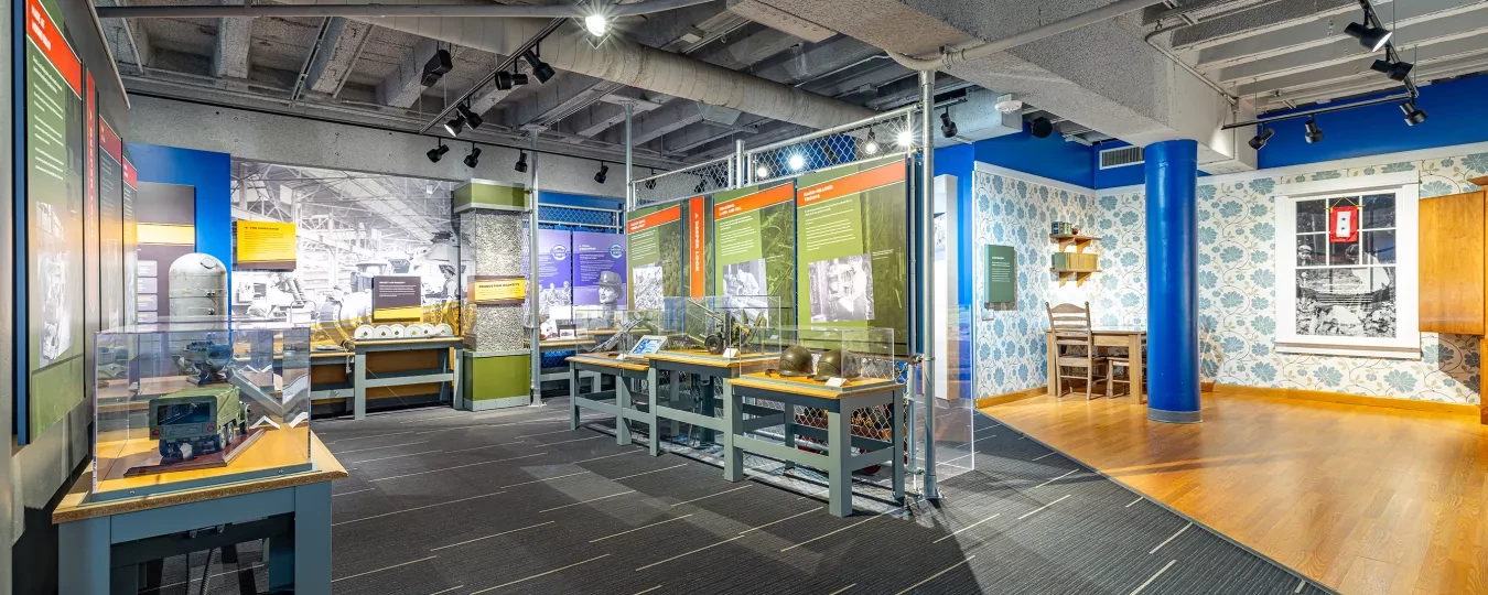The gallery is divided into three main sections, representing the arenas where Detroit was linked to the war effort: the factory, the community, and the home. It delves into rationing, victory gardens, allied propaganda, and other ways the war overseas altered the daily existence of everyday Detroiters.