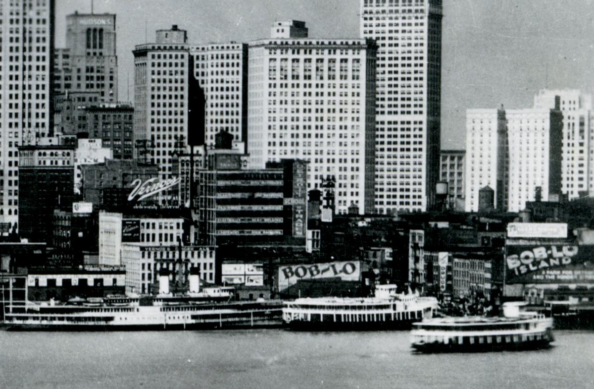 James Vernor passed away at the age of 84 in 1927. The company continued to thrive under the leadership of his son, also named James Vernor. A massive sign illuminated with the company logo became a landmark along the Detroit riverfront (pictured below), where ferries took passengers to Windsor, Bob-lo and Belle Isle. By the 1940s, the Vernors bottling plant took up an entire city block along the river and welcomed thousands of daily visitors to its soda fountain. In 1954, the plant moved to Woodward and Canfield, where visitors could watch soda production as they enjoyed their drinks.