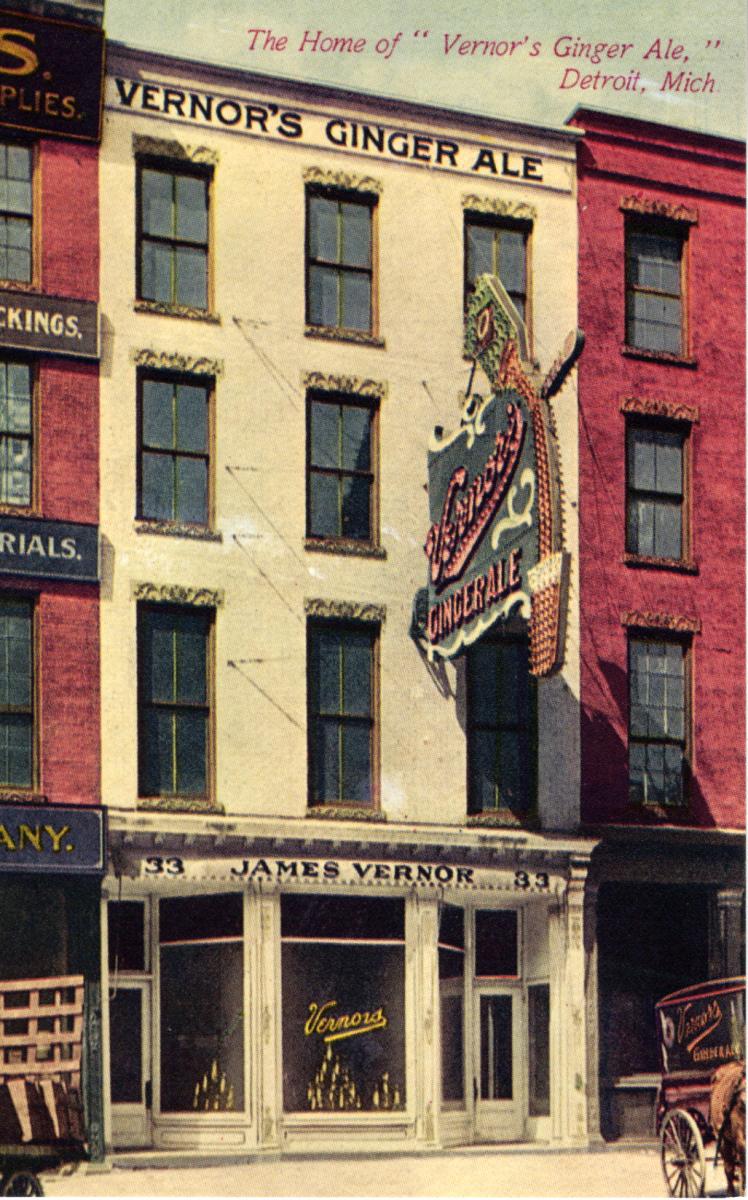 As demand grew, Vernor began to sell his product to other Detroit soda fountains, but required that vendors purchase special equipment to serve the soda in order to ensure its quality. After gaining enough fame, Vernor was able to sell his soda throughout the Midwest. In 1896, he closed his pharmacy (shown at left) and opened a bottling plant at the foot of Woodward so that Vernors could be mass produced.