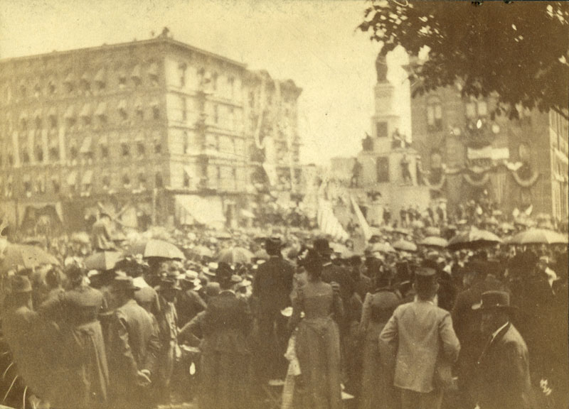 In honor of Veterans’ Day, we have unearthed a series of cabinet cards depicting the 1891 National Encampment of the Grand Army of the Republic in Detroit. As the Civil War was just twenty-six years past, the organization’s ranks were sizable, as was the turn out of the crowd. This first photo of the Michigan Soldiers’ and Sailors’ Monument in Campus Martius attests to that. Notice the building on the right, that’s the old Central Market Building. This building used to stand at the mouth of Cadillac Square, on the site of the City Hall which predated the one you may remember between Fort and Michigan.