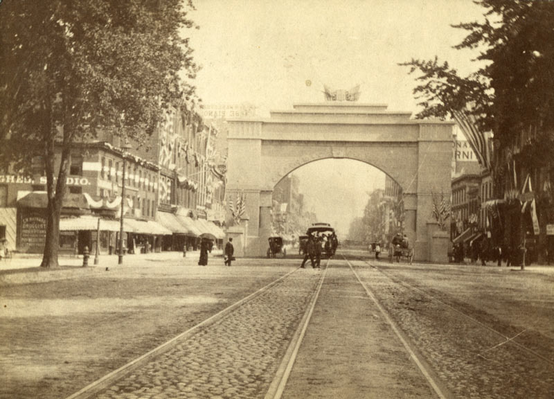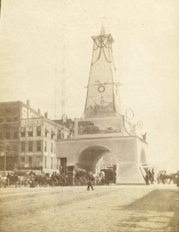 My favorite of the arches set up by the G.A.R., was the one positioned at Woodward and Jefferson. This one added an obelisk to its top, decorated with Civil War scenes including the battle between the Monitor and Merrimack. You can spot a pair of the old horse-drawn streetcars passing underneath the arch. And yes, we do have more from this series, as well as a whole lot more which will be available when our digital collection goes live in May as part of our Past>Forward Campaign! Please continue checking back for more news about this exciting project! Did you attend last week’s Veterans’ Day parade or do you have any Detroit Veterans’ Day memories? If so we’d love to hear about it in the comments.