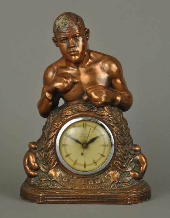 Since tomorrow is African American History Day at the Detroit Historical Museum, we are sharing some of the objects in our collection related to one of Detroit’s most famous sports heroes, boxer Joe Louis. This circa 1940 electric clock was manufactured by United Clock Corp in Brooklyn, New York. Emblazoned with “Joe Louis World Champion”, it lionized the man who won his first World Heavy Weight title in 1937 and retained the position until announcing his retirement in 1949.