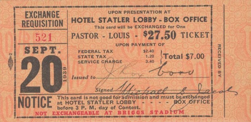 Joe Louis’s manager was issued this exchange requisition card (i.e. a ticket to get a ticket) for his client’s bout against Bob Pastor at Briggs Stadium (later Tiger Stadium) - a fight Louis won, in typical fashion, with a knockout. Louis fought seven professional matches in Detroit during his career, although the only venue still standing is the Broadhead Naval Armory.