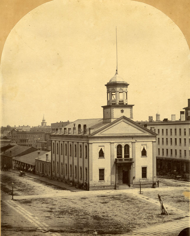 In the past we've mentioned Detroit’s original City Hall, which stood in what is now Cadillac Square. Prior to 1885, Cadillac Square was a street known as Michigan Grand Avenue, part of Augustus Woodward’s plan for rebuilding Detroit following the 1805 fire. In 1835, a section of this broad avenue was chosen as the site for Detroit’s first City Hall. This City Hall was a multipurpose building of sorts. The spot on Michigan Grand was conceived to contain both the City Hall as well as the Central Market, and as such the lower floor of the new building housed meat vendors. City officials could be found on the second floor, but so could theatrical performances and religious services. When the newer City Hall was dedicated in 1871 directly across Campus Martius, its smaller predecessor was briefly slated to become a library. Alas, it was decided it would be more cost effective to build a new library rather than convert the old city hall, and it was torn down in 1872.