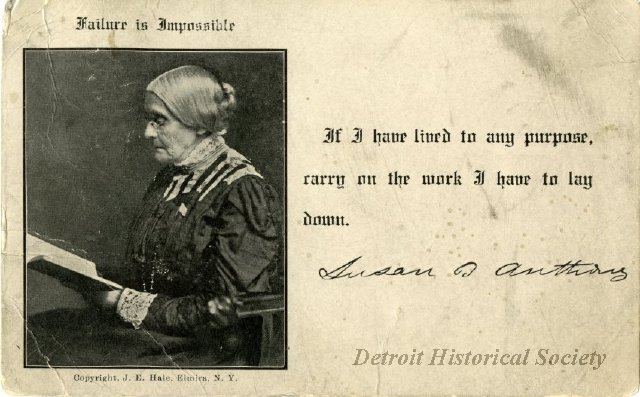 On February 15, the anniversary of Susan B. Anthony's birthday, the Detroit Historical Society is pleased to share from the collection a 107 year old postcard depicting Susan B. Anthony. Social activist Susan B. Anthony (1820-1906) was an internationally recognized leader in the long campaign to give women the right to vote. It turns out that the postcard's addressee, Dr. Sarah Gertrude Banks, has an important place in Detroit history.