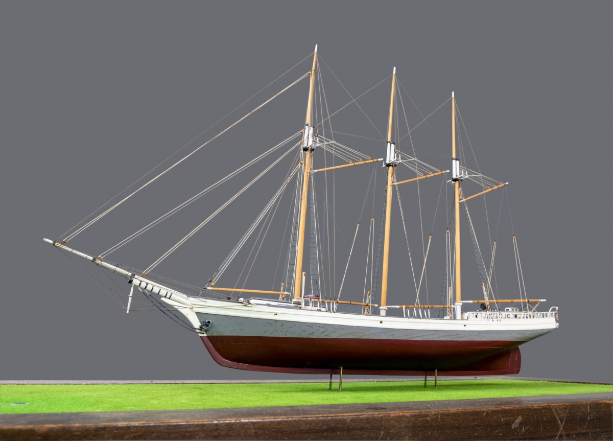 This ship model of the J.T. Wing was designed and created by the Kovach Brothers – John and Sam, and was accessioned, or accepted, into the collection in 1959. The model features the Wing’s iconic 3 masts without sails, each mast is stained a natural color similar to what the real masts would have looked like.