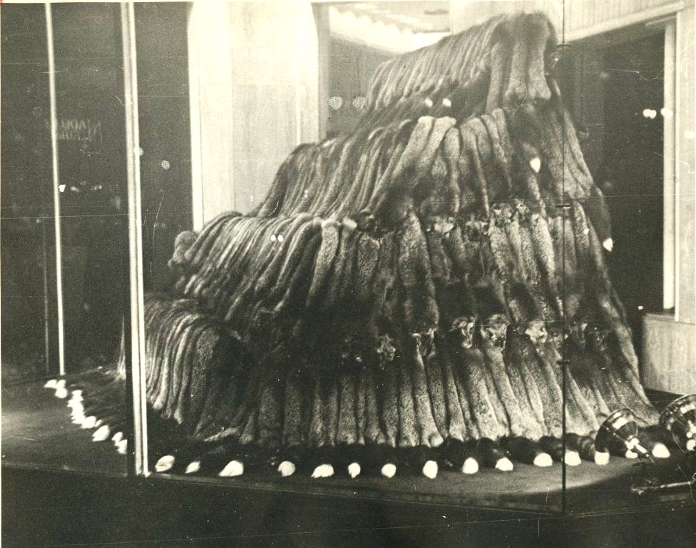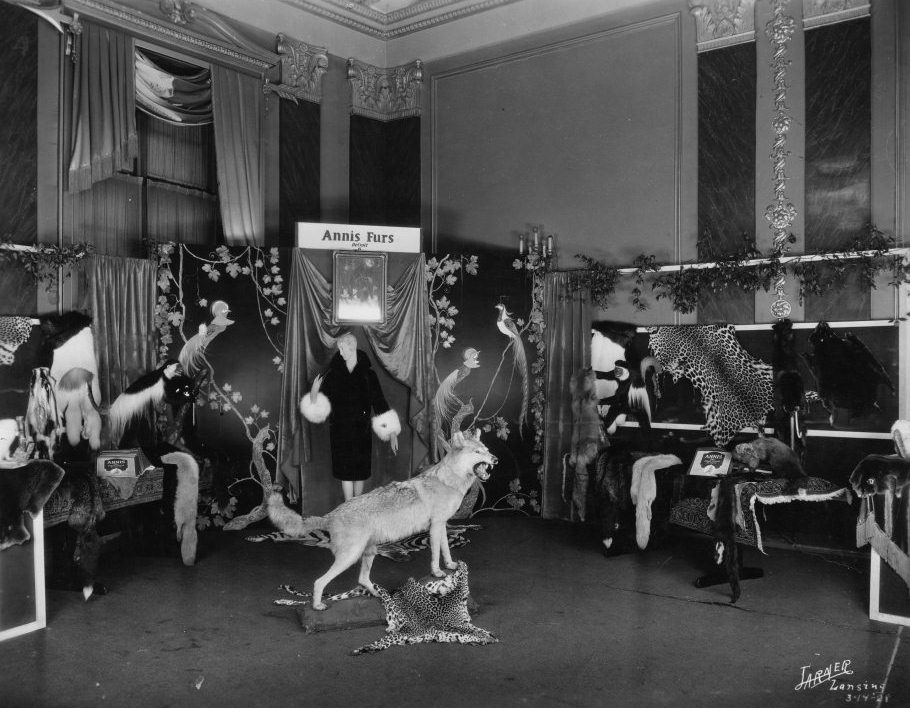 This shot of the Annis showroom gives us a sense of their over-the-top styling. Mounted animals on top of draped exotic pelts surround a female mannequin who seems oblivious to her curious environment. Bundle up!