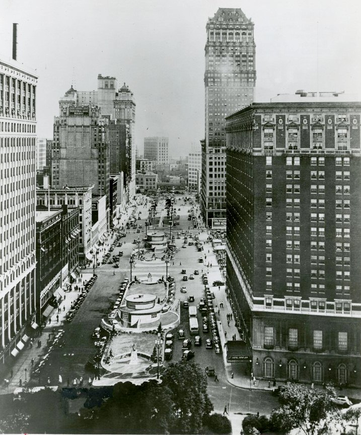 With all the changes Washington Boulevard has gone through, of course there were plenty more ideas which were abandoned. Postcards, seemingly from another universe, show both the non-existent Aviation Town and Country Club Building, and the Book Tower we know dwarfed behind an even larger Book Tower on the southern end of the Book Building. The back of the Book Tower card boasts that the structure is 873 feet tall, 81 floors, and the tallest building in the world with no hint that the structure did not yet exist, and due to the Great Depression, would never. Had it, it would tower over a hundred feet above the Renaissance Center. Below at street level, Washington Boulevard, prior to the red tube-lined pedestrian mall, was proposed as an entrance to an underground parking structure in a 1946 photo composite. And as the city continues to change, we will continue to see plans for Detroit which will get left by the wayside for better or worse. Will future Detroiters view the animation of the Woodward Avenue Light Rail Project or concept art of the Cadillac Centre the same we see the 873 foot tall Book Tower, or will they simply see an early incarnation of a piece of their world?