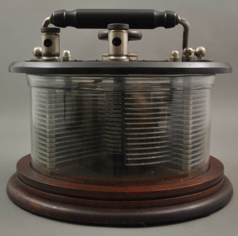 This variable condenser was manufactured by Clark in 1898. Within its glass shell are fifteen aluminum plates, which can be rotated using a dial on the top to control how much electromagnetic energy the unit can store, similar in purpose to modern capacitors.