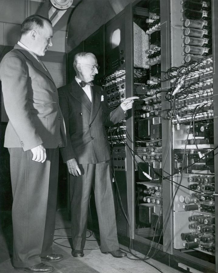 Thomas E. Clark (right) and WWJ Engineer E.J. Love (left) inspect some of the station’s broadcasting equipment, c. 1950.