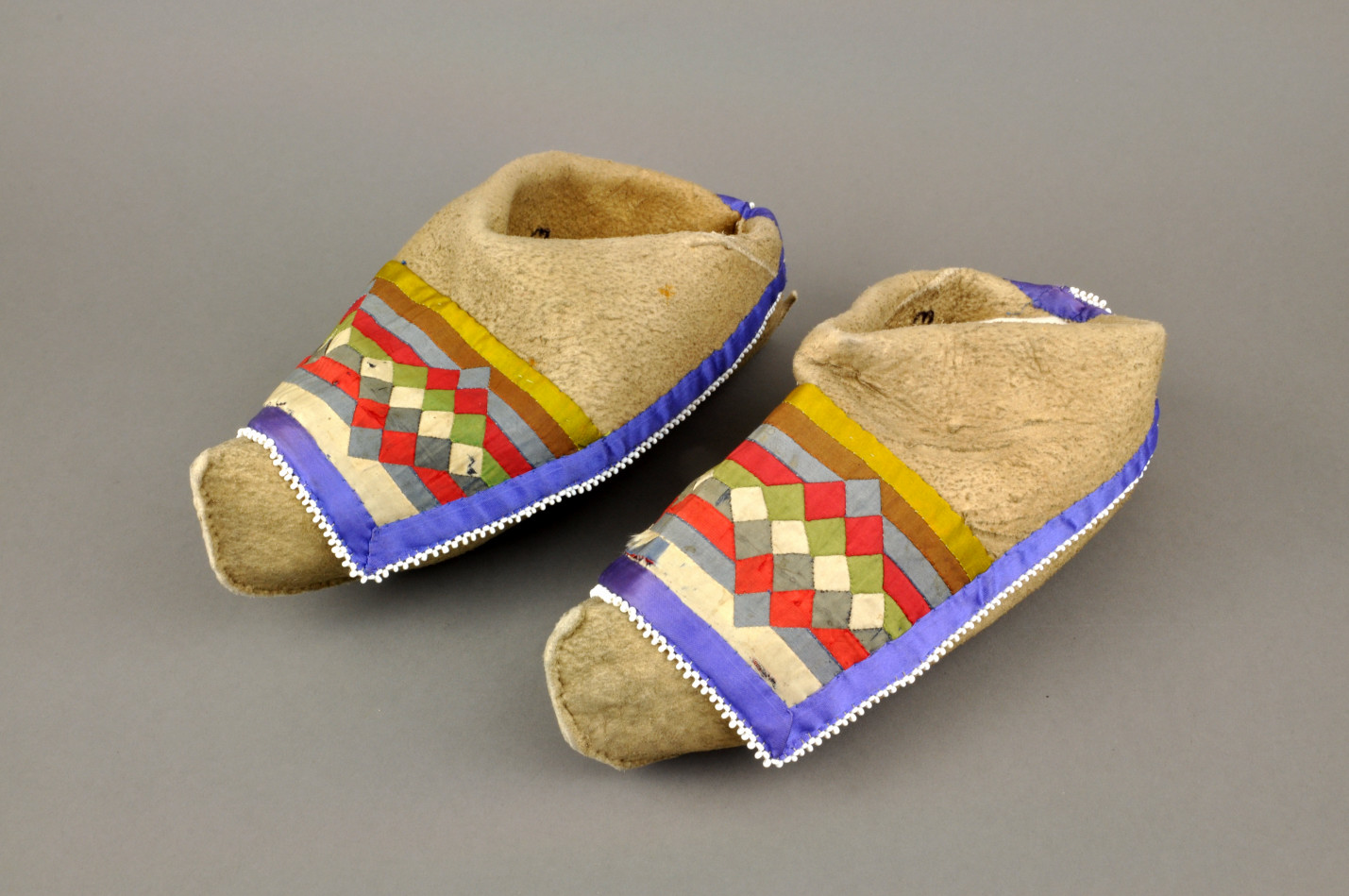While the DHS artifact collection is primarily centered around metro Detroit objects, there is a significant collection of Native American material from throughout the Great Lakes region. As the ancestral home to more than a dozen different tribes, the Great Lakes were a source of food, transportation, clothing, shelter, and trade for thousands of years. With the establishment of Detroit came manufactured trade goods. One of the more common trade items among American Indians were glass beads. These beads were used in a variety of ways to adorn every day objects such as containers, tools, and clothing. The one article of clothing that is most unique among American Indians is footwear—commonly known as moccasins. Each tribe had very distinct ways of constructing and decorating their moccasins to identify who they were. While the collection contains several pairs of moccasins, we have picked these three distinctive pairs from different tribes to share.