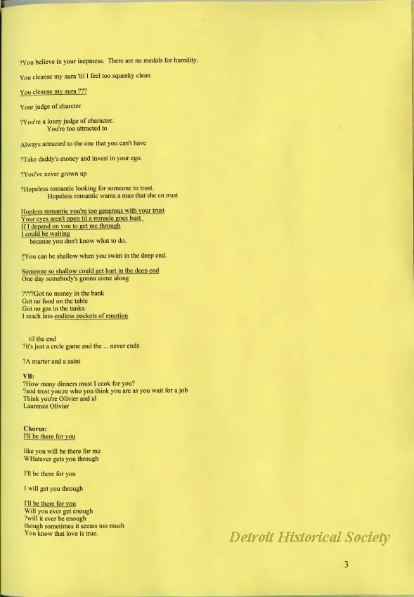 Across 27 typewritten pages, the lyrics to what eventually would become the 45-second Friends theme, “I’ll Be There For You,” reveal an involved process. Willis began by working directly from the show’s pilot; “I watched the pilot and wrote down every characteristic of every character and then tried to make up lines about them.” From these concepts flowed a litany of possible frustrations felt between the characters—ranging from dealing with the smells of second-hand aroma therapy to the tolls of freeloading roommates—contrasted with the now iconic affirmation of support expressed in the chorus. Willis explained, “when you’re writing for something so specific as a TV theme you try every possible permutation of every line that you like. The only thing the producer of the show told me was that the title was to be ‘I’ll Be There for You.’ So I had at least 25 different choruses to sing for the producers with that line in it and at least 50 verses when I presented it to them.” About these unused lines, she continued, “if a line is really great and doesn’t get used in a song I catalog it and usually end up using it in something else. But the Friends lyric had to be so specific and so simple that I didn’t save any of those lines for further use.”
