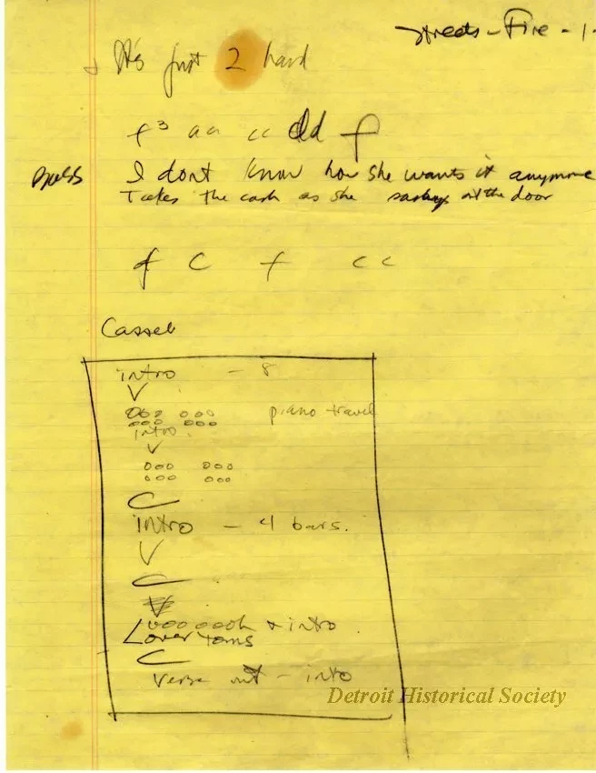 Reading the drafts today, there’s almost a sense of inevitability each time one of the final lyrics first appears. Willis describes how these breakthroughs played out during the writing process; “The first line I got that I knew was a keeper was ‘Your job’s a joke, you're broke, your love life’s DOA.' I always liked internal rhymes, especially on long lines. And the ‘A’ in ‘DOA’ is a great syllable to hold if the note is long. Second one I got that I knew was a keeper was 'Well it hasn’t been your day, your week, your month or even your year.' Something was falling apart in the lives of all the characters and I liked making a play on a common phrase.” In her notes, Willis mentions performing early versions of the theme for the show’s producers on the studio lot. While reading the lyrics, it’s tempting to attempt to sing along yourself to see how these early drafts might have sounded. When asked if these nascent versions of the theme followed the now familiar final melody, Willis responded, “The melody, written by Michael Skloff, remained the exact same from the time it was written to what we ended up with. I usually write both music and lyrics but I needed one more song to fulfill my publishing deal, which I was eager to get out of. So I agreed to just write the lyric. I never expected it to be a hit.” Willis’ “Neutron Dance” is widely remembered for scoring the chase through the streets of—appropriately—Detroit near the beginning of the 1984 classic Beverly Hills Cop. However it was originally conceived for a very different movie, Walter Hill’s cult “rock & roll fable” Streets of Fire. Befitting that film’s bleak yet musical retro-futuristic setting Willis bridged the concepts of 1950s doo-wop with nuclear devastation, and brought in a bit of her own experiences. Willis elaborates, “I hadn’t seen Streets of Fire before writing the song but was told that people were trying to escape a nuclear holocaust. So I knew that the hook line had to have something to do with fire, explosion, or nuclear something." Even within that premise, Willis made the song's themes personal and easily relatable. She reveals, "The entire song was written in under an hour. It was very autobiographical. It was the first time in years that I had gone without hits and I wanted to write a song about not giving up and that if your life isn’t working it’s up to you to make a change. Someone could push the button tomorrow and we’d all be up in smoke so get off your ass and do something—i.e. Do the Neutron Dance. When we (co-wrote with Danny Sembello) finished the song in 58 minutes we had everything but the title.”