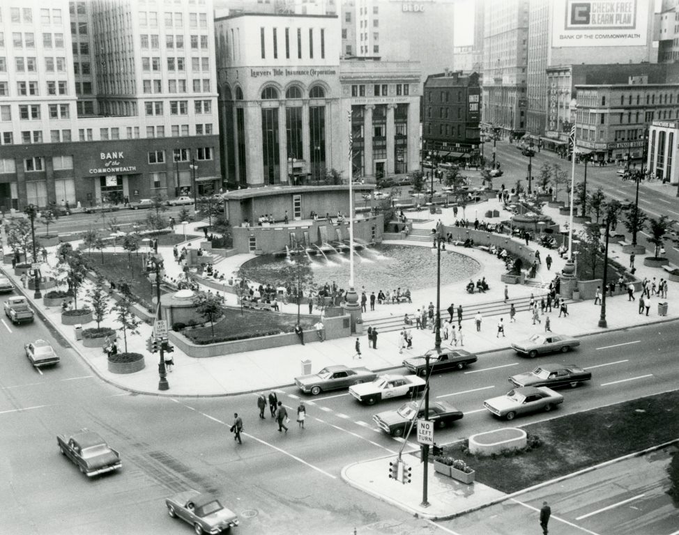 In its place appeared Old City Hall Park, a placeholder until the site could be redeveloped. This spartan park lasted until 1965 when it was torn up to construct a parking garage capped by a concrete plaza named Kennedy Square. A large fountain dominated the new park but it was plagued with problems. Leaks, maintenance costs, and safety concerns lead to the water being turned off for the final time in the late 1970s. The barren plaza then stood without improvement until construction began on One Kennedy Square in 2005. Many more images of Kennedy Square can be found in our online digital collection.