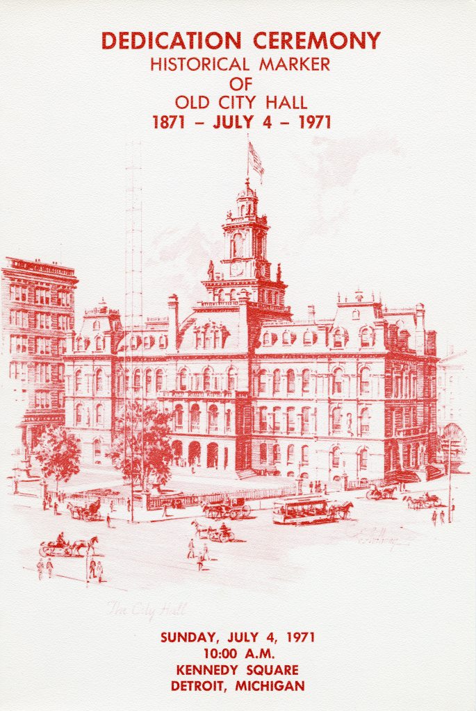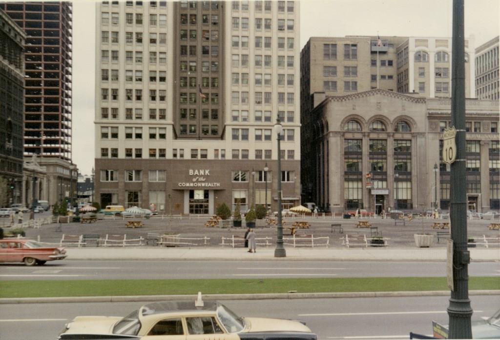 1961, the debris of Old City Hall.Much like the Kern Block, Kennedy Square was a mid-century development on the site of a razed historic Downtown Detroit building. Old City Hall stood from 1871 to 1961 on the west side of Campus Martius. Although its demolition was bitterly contested, arguments against the building’s unfashionable color and style, lack of fire safety, and outdated elevators and plumbing eventually won out. The seat of government had already moved to the City-County Building in 1954, making the Old City Hall obsolete.