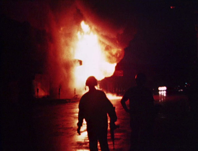 In 1967, Edward Breslin worked in Chevrolet’s public relations department, where he had a reputation as a practical joker. In his previous career, however, he had worked as a reporter and a photographer covering crime for the Detroit Times and Detroit Free Press. When the unrest of that summer broke out, Breslin’s old reporter instincts kicked in, and he set out with a camera in hand. His footage attests that he still had contacts in law enforcement; during the course of the film, Breslin shoots from the police line along 12th Street, rides in a helicopter above several massive plumes of smoke, and tags along in a military vehicle during a night time patrol. He’s also present as Wayne County sheriffs search a car and frisk its occupants, and his camera rolls as firefighters work to put out several blazes. His most striking footage may his nighttime footage of silhouetted troops watching as orange flames swirl from the husks of burning buildings.