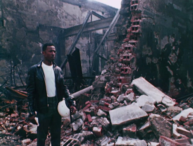 A man stops to pose for a photographer and for Breslin's film in front of the remains of a building on the west side of 12th Street between Hazelwood and Taylor Streets.