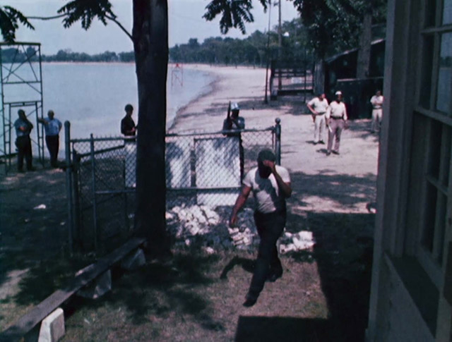 While Breslin shot plenty of street footage of crowds, smashed storefronts, and fire-damaged buildings, his most unique footage likely comes from several of the special locations he visited. At St. Gregory Parish, Breslin found a long line of neighborhood residents waiting for groceries distributed by the nuns within. Here, a Boy Scout can be spotted walking along the line, distributing neckties. Downtown at police headquarters, Breslin films a group of arrestees climbing out of a crowded police truck. He then moves to a waiting room inside where several of the handcuffed men appear to wave to the camera. With the numbers of arrestees exceeding capacity for traditional incarceration, authorities began housing prisoners on city buses and in Belle Isle’s bath house. Breslin’s film reflects this with a series of shots showing a city bus arriving at a make-shift checkpoint beside Belle Isle’s beach. In the following scenes, officers stand by as a row of men file past stations where they receive blankets. Perhaps the film’s most powerful moment comes as part of Breslin’s visit to Detroit General Hospital where his camera lingers on the chains that keep several patients handcuffed or shackled to their hospital beds.