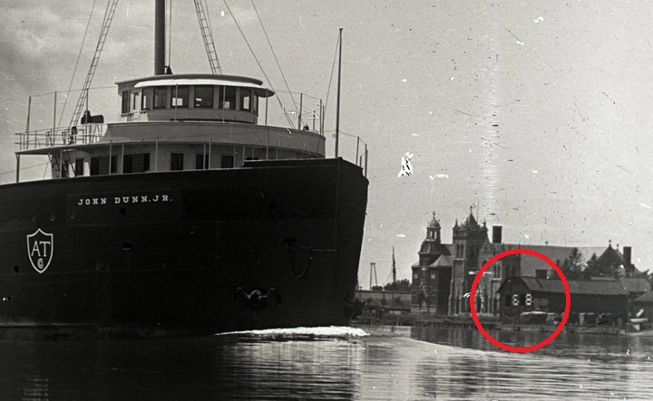 In this detail from a c. 1910 photo of the American Transportation Company freighter JOHN DUNN JR., passing Marine City, you can see the seven figure display used to tell passing sailors the temperature next to Holy Cross Church.
