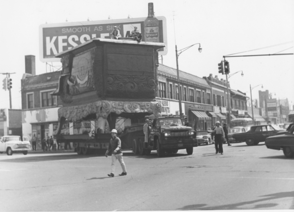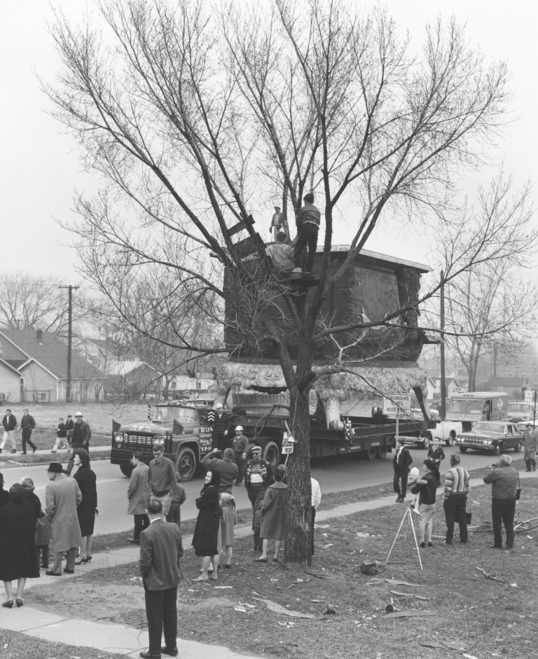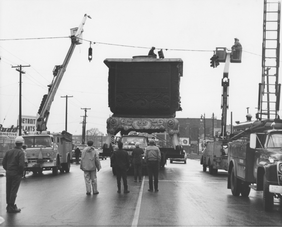 Large home appliances are always a pain to move, but be grateful you have never had to move an appliance as big as a team of volunteers did in Detroit in 1965. Prior to the dominance of the auto industry, Detroit was well known as the home to several major stove manufacturers. One of them, the Michigan Stove Company, commissioned the “World’s Largest Stove,” made of 15 tons of hand-carved oak, as their contribution to the 1892 World’s Columbian Exposition in Chicago. Following the fair, the stove was brought to the city to stand as a landmark outside of the Michigan Stove Company’s headquarters at Jefferson Avenue and Adaire Street. After the Michigan Stove Company merged with the Detroit Stove Works in 1927, the stove was moved up the road to the newly formed Detroit-Michigan Stove Company just east of the Douglas MacArthur Bridge to Belle Isle. Unfortunately, in 1955, the shift toward modern gas and electric ranges put the Detroit-Michigan Stove Company out of business. A decade later, when developers expressed interest in the land beneath the stove’s four mighty legs, a coalition of city officials, private companies, and individuals came together to save the landmark.
