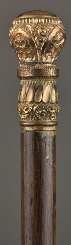 [slideshow]This cane with an ornate gold-plated handle was recently found at the Dossin Great Lakes Museum. While the golden handle is certainly the most eye-catching feature, the humble wood below has quite a story to tell—it was once part of a steamship called the Independence. Built in Chicago in 1843, the 118 foot long Independence was the first propeller-driven ship built on Lake Michigan and eventually the first steamship to operate in Lake Superior. There the Independence played a role in Michigan’s valuable copper industry, once carrying a 1,750 pound chunk of ore out of Copper Harbor in 1846. However, her career was cut short by a boiler explosion in 1853 which not only shattered the ship but took the lives of four people. The maker of this walking stick preferred to focus on the Independence’s triumphs rather than its tragedy as the central band around the handle reads, “Wood of the Independence first boat sailed L. Superior.” Other pieces of the Independence have been fashioned into souvenirs, making this beautiful, if unexpected tribute, apparently not an isolated case.