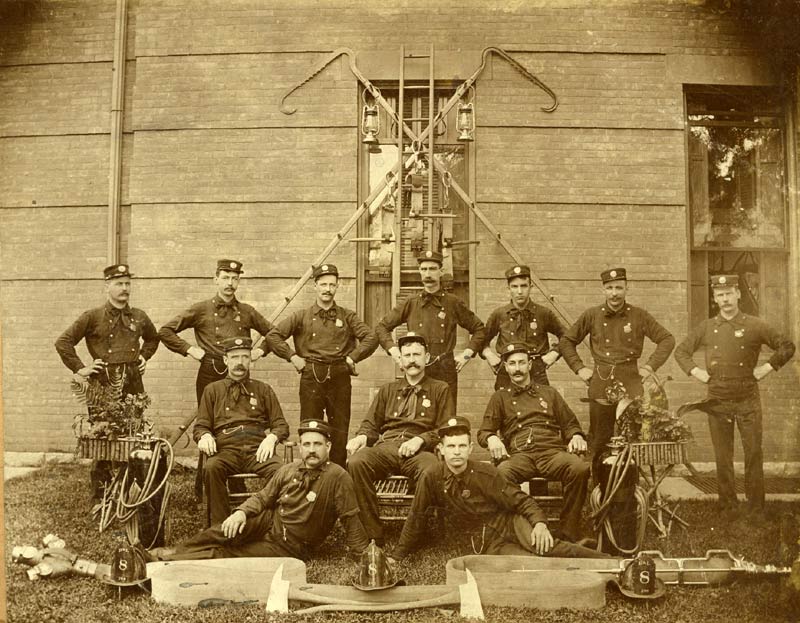 Over the past couple weeks we have been scanning a series of boxes of photographs donated to the Detroit Historical Society by the Detroit Fire Department primarily in the mid-1950s. Within have been a multitude of portraits of chiefs, entire companies proudly posing alongside their early horse-drawn apparatuses, action shots, and even a few fire dogs. While I love the early engines, the stone masonry of the firehouses, and the sense of learning about those everyday people who get left out of the overarching narratives of history, my favorite of this batch has been the portrait of Hook and Ladder Company No. 8, who were stationed on Dix and Vinewood in the latter portion of the 1800s. Fortunately most of the firefighters of this company were named on the photo’s back, a rarity in many of these group shots. Not content with simply standing with their wagon in the street before their station, the firefighters of this company, possibly guided by an ambitious photographer, arranged their equipment as well as themselves into an elaborate composition. Behind a frame of fire hoses, axes, and helmets emblazoned with the company’s 8, a pair of firefighters, Bill Egan and Fitch Buckendale, recline side to side. Are they relegated to the floor because they’re the newest members (after all, Buckendale is one of the company’s mere two non-mustachioed members) or because they selflessly volunteered to do so? Behind them, three firefighters, Joel McKenney, Captain Irwin, and one unknown man sit in chairs flanked by shiny brass fire extinguishers, much like one in our collection. As the captain is among them, I can only imagine rank was the determining factor here. Behind them Henry Konen, Bill Wilkins, T. Noyes, G. Shea, W. Cilian, C. Gaffney, and Martin May stand arms akimbo in a tight row, the camera perfectly capturing the light glistening from their badges, buttons, and chains. The company’s namesake—a pair of crossed hooks centered underneath a ladder, provides the perfect backdrop.