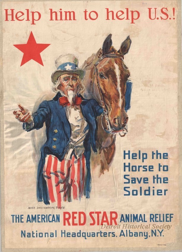 A series of posters within the Detroit Historical Society’s collections promote an often-overlooked support group from World War I, the American Red Star Animal Relief. A division of the American Humane Association, the Red Star provided aid to horses serving in the war. The group was formed in 1916, when U.S. Secretary of War Newton D. Baker invited American Humane to assist horses in the same manner that the American Red Cross assisted soldiers. Despite not yet in the war, the United States had been shipping beasts of burden overseas in mass quantities to be used by allied nations. Red Star provided assistance in the form of bandages, medicines, ambulances, and personnel including volunteer veterinarians, stable hands, and blacksmiths. Red Star cared for more than 68,000 injured and sick horses every month. World War I was one of the last major conflicts to involve horses in a serious way, particularly in a combat capacity. Until this point, mounted cavalry was a critical piece of any military presence, but this declined as the war progressed. The development of trench warfare, the expanded use of barbed wire, and machine guns made horses much less viable in combat roles, even a liability. Cavalry operations all but disappeared on the Western Front. Shock tactics that would have employed cavalry shifted to use tanks instead. Despite their diminished combat roles, horses and mules were indispensable for transportation of munitions, food, artillery guns, and much more. They were far more adept than automobiles at traversing difficult terrain like deep mud. This made them valuable and reliable for reconnaissance and delivering messages. It is estimated that several million horses died during World War I. Much like human casualties, the majority came from disease or accident, with only about a quarter of all horses dying in combat. However, horses made large targets for artillery and machine gun fire and were sometimes deliberately aimed for. During the Battle of Verdun, 7,000 horses were killed in one day from artillery fire. The loss of horses over the course of the war was so severe that a “horse shortage” manifested. Requests for new mounts became increasingly difficult to fulfill, making the Red Star’s job of getting wounded horses back into action all the more important.