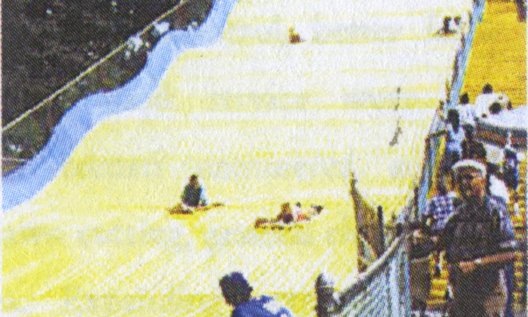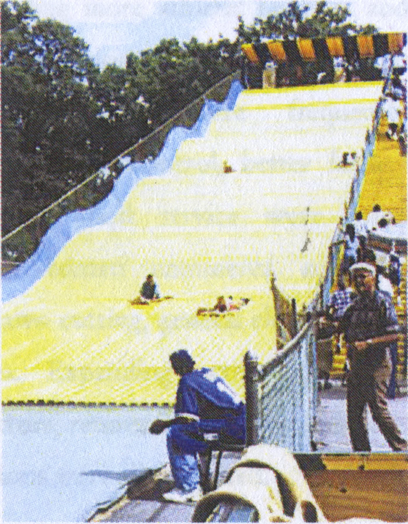 While the current slide has been in place for several years, it is not the original that Detroiters of a certain age remember riding. That original slide was opened on July 4th, 1968. It was manufactured by a California-based outfit called Sky-Slide International. It had a distinctive yellow fiberglass surface and was about 45 feet high. Riders would climb the stairs along the slide’s right side to a platform from which they’d speed down atop a burlap potato sack over the slide’s dips and humps.