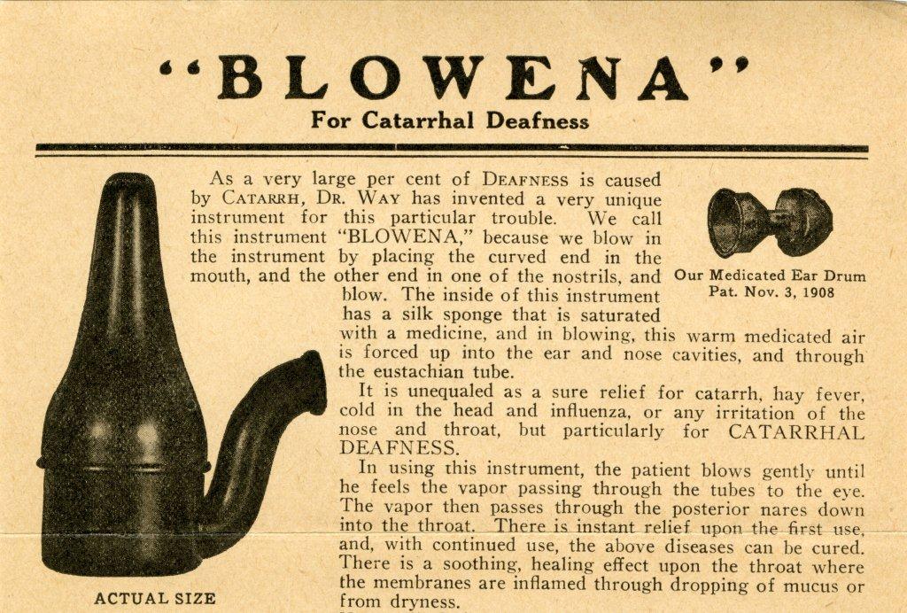 With the opening of the Gallery of Innovation fast approaching, many of Detroit’s lesser known innovators will be spotlighted. However, one name that might not make the cut is George P. Way, of the Artificial Ear Drum Company. Recently we came across a packet mailed in 1922 from Way’s company to a prospective client in California, in which Way attempts to sell both a medicated ear drum as well as a device called the “Blowena,” both purported to cure deafness. The Blowena consisted of a rubber hose through which a patient would blow air from their mouth, past a medicated sponge, into their ear in order to relieve "catarrh, hay fever, cold in the head and influenza, or any irritation of the nose and throat, but particularly for catarrhal deafness." Mr. Way’s inventions are part of a rich history of devices of dubious effectiveness sold as remedies for the deaf and hearing impaired from the 19th and early 20th century.