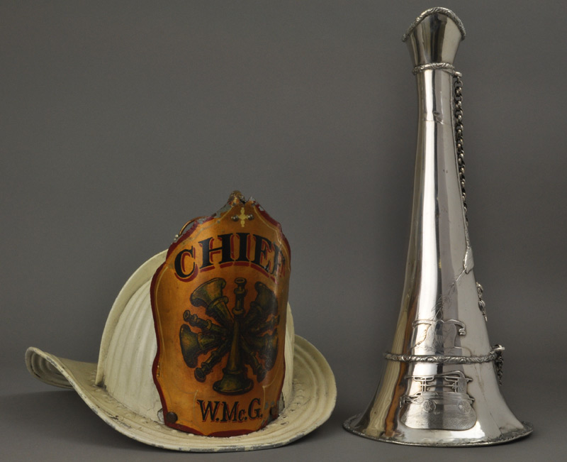 The firefighter’s speaking trumpet, commonly called, simply, a bugle, is an important symbol of authority within the profession, and for good reason. Among the chaos of smoke and flame, coordination becomes necessary for not only success in battling the blaze, but also survival. In the days before the modern amplified bullhorn, speaking trumpets were the best way for a chief to make his orders heard. As a result the bugle became a symbol of authority in the iconography of firefighters. Even today rank can often be determined by the number of bugles pictured on a firefighter’s helmet or elsewhere on his or her uniform. A captain might just sport a pair of bugles, while a Chief Engineer, such as the one who wore the early 20th century helmet pictured, would have a crest bearing five crossed bugles. Of course these early chiefs would cement their power with an actual bugle through which they’d command their firefighters. This could be a significant challenge, judging by a chapter in the early history of Detroit’s firefighters. In the early 19th century, fire companies, although generally created by Detroit’s common council, were staffed by volunteers, and operated independently. Rivalries, ranging from playful to outright hostile were widespread among these early companies. When a disgruntled ex-printer from Detroit Gazette drunkenly set fire to his former employer on April 26, 1830, three of these companies arrived at the scene. Chief Engineer Levi Cook was unable to rally the three companies into a concerted effort, and the Detroit Gazette consequently attacked the discipline of the firefighters, resulting in a Common Council arranging a special experiment in cooperation for the three companies the following day. This is of course not to imply that the volunteer fire companies of these early days were ineffectual, as a beautiful silver bugle in our collection attests. Around 1 AM on April 16, 1849, a watchman in Detroit sounded an alarm in response to a warehouse fire across the river, in Windsor. Coupled with powerful chilling winds, the flames threatened to destroy the neighboring city. Under the command of Chief Engineer William Duncan, several companies gathered at the waterfront and awaited steamers to arrive which would list and nearly capsize into the freezing river as they cautiously ferried the firefighters and their bulky engines across. Thanks to the combined effort of the firefighters of both cities, the blaze was brought under control by 5 AM, and damage was confined to an acre. To express their gratitude, the people of Windsor presented Duncan with a silver bugle engraved with an inscription praising the Detroit firefighters for their “noble and generous conduct,” alongside an image of a hand-pumped fire engine, and symbols representing both the United States, and the British Empire.