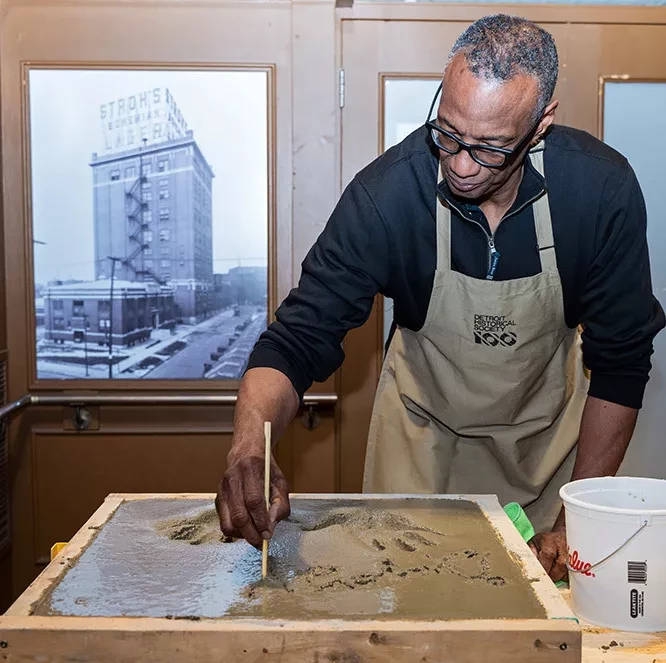 Greg Kelser, sports analyst and Detroit Pistons broadcaster, Huel Perkins, Emmy Award-Winning former Fox 2 news anchor, and Mickey Redmond, Detroit Red Wings color commentator set their hands and signatures into wet cement in front of museum visitors in the Streets of Old Detroit. The day also included a live podcast from the museum's auditorium and a historical presentation by Detroit Historical Society Director of Collections Jeremy Dimick on the significance of the 1935-36 season, when all of Detroit's major sports teams won championships.
