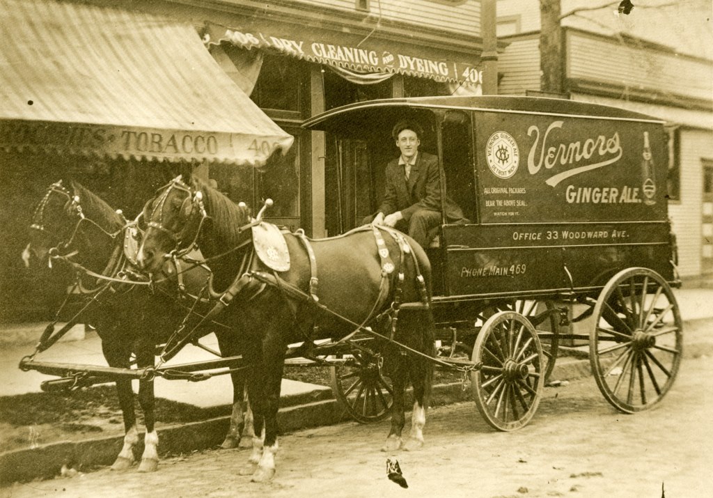 By 1950, the City of Detroit had formulated plans for Cobo Hall and riverfront re-development, and wanted to acquire the Vernor’s factory property. The City and Vernor’s agreed to a land swap where Vernor’s would move north to a parcel located on the west side of Woodward between Canfield and Forest Streets. This new site had previously been the location of the old city Convention Hall. The company built a large, modern factory complex at 4501 Woodward Avenue, which opened in 1954. The new plant included a soda fountain and offered tours. It had large glass windows along Woodward, which allowed pedestrians and motorists to view the huge bottling operations. Although the Vernor family decided to sell the company in 1966, subsequent owners have continued to produce Vernor’s Ginger Ale, which still maintains a loyal following in Michigan and the Midwest. Our online digital collections include many photographs of Vernor’s plants, soda fountains, delivery trucks, and company memorabilia.