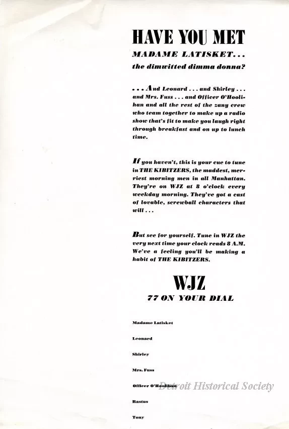 One sheet of paper with an advertisement for the radio show, "The Kibitzers," printed in black ink. The advertisement asks the reader if they are familiar with the variety of characters which Toby David and Larry Marino create for the show. The show aired at 8 a.m. on WJZ radio.
