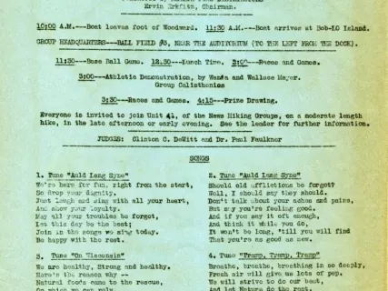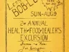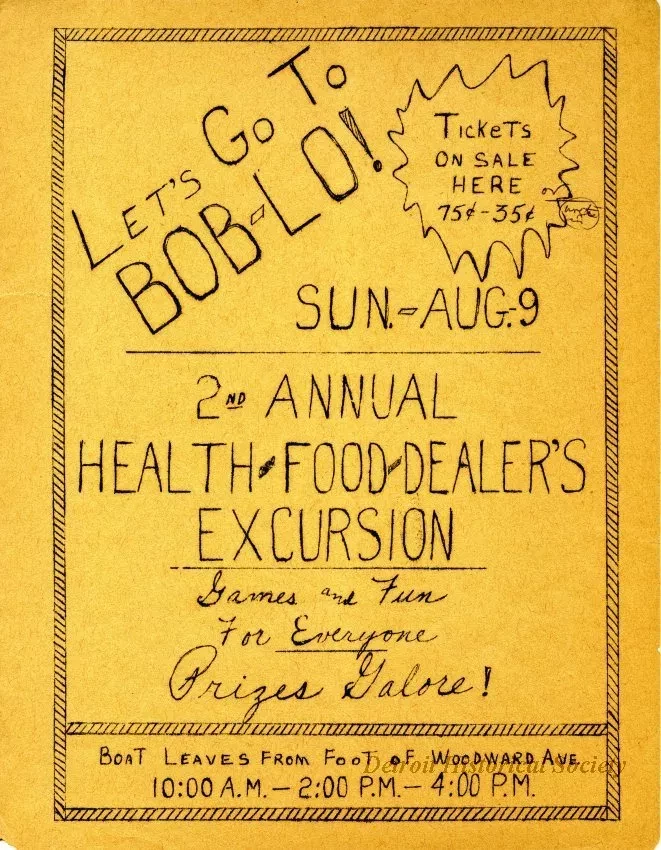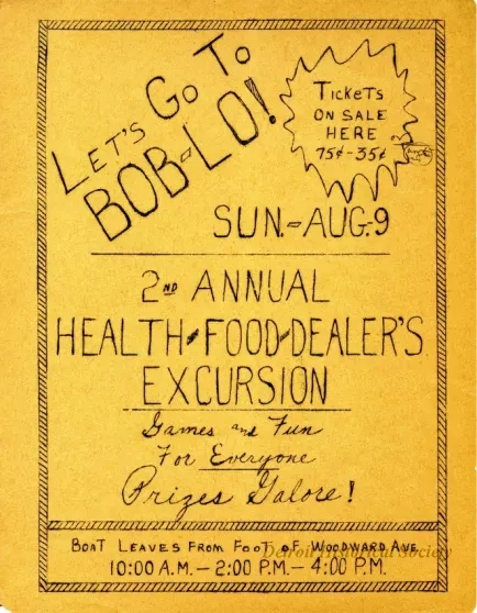 One advertisement for the "2nd Annual Health Food Dealer's Excursion to Bob-Lo" which was scheduled to take place on Sunday, August 9, 1942 The advertisement is printed in black typewritten text on tan/brown paper. It includes event details, ticket prices, and the Bob-Lo boat departure schedule.