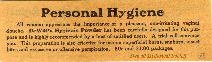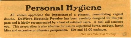Small double sized printed advertisement for ManZan, on the recto, and DeWitt's Hygienic Powder on the verso.