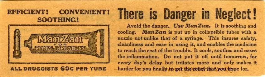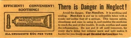 Request ImageSmall double sized printed advertisement for ManZan, on the recto, and DeWitt's Hygienic Powder on the verso.