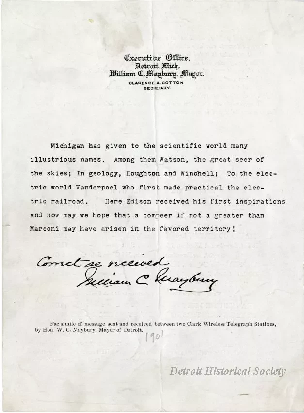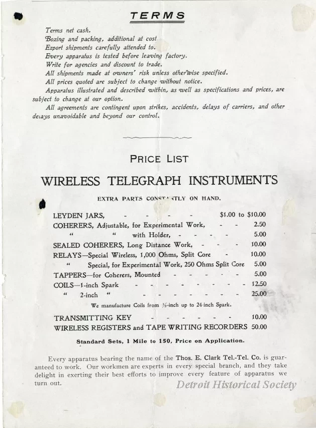 Advertisement and price list for the Thomas E. Clark Wireless Telegraph and Telephone Company. The recto contains a "facsimile of a message sent and received between two Clark Wireless Telegraph Stations, by Hon. W.C. Maybury, Mayor of Detroit," as per the caption comparing Thomas E. Clark to other important Michigan scientific figures--James Craig Watson the astronomer, Douglass Houghton and Newton Horace Winchell the geologists, Charles Vanderpoel who "first made practical the electric railroad," and Thomas Edison. He also states that Clark is "a compeer if not a greater than Marconi." "1901" has been handwritten beside the caption. The verso contains the terms of sale as well as a price list covering Leyden jars, coherers, sealed coherers, relays, tappers, coils, transmitting keys, wireless registers, and tape writing recorders.