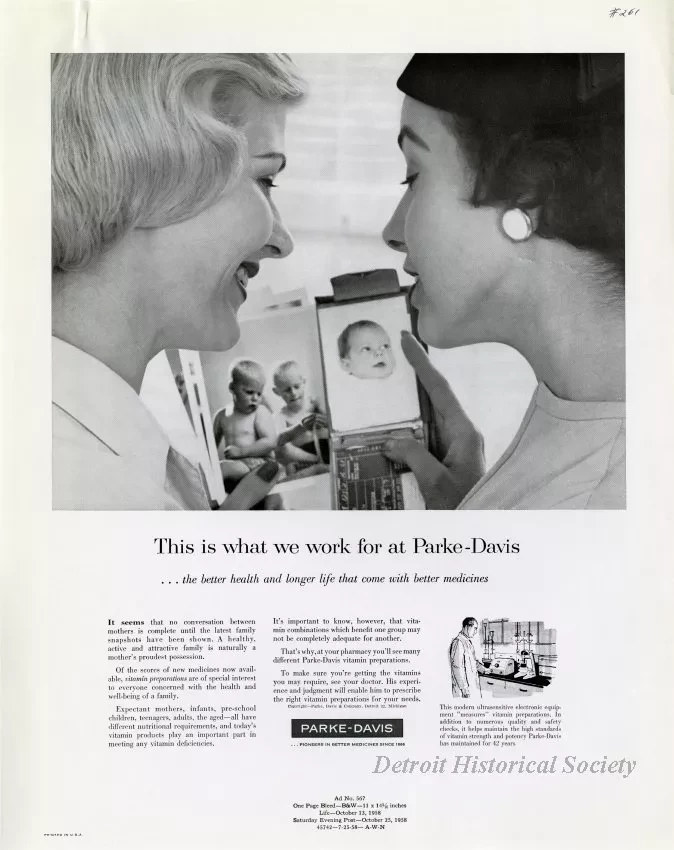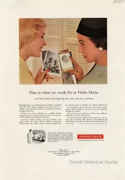 Color and black and white print advertisements for vitamins produced by Parke-Davis. It depicts two women looking at baby pictures.