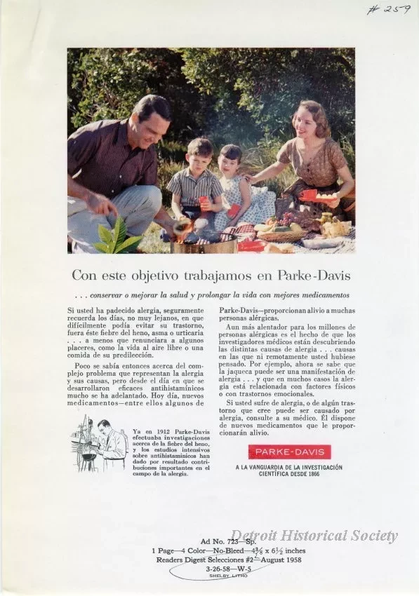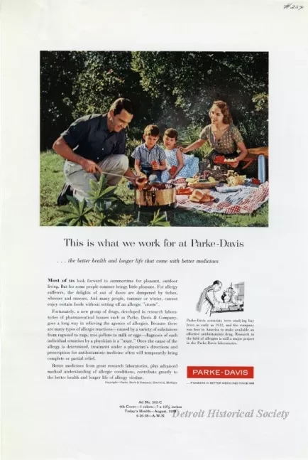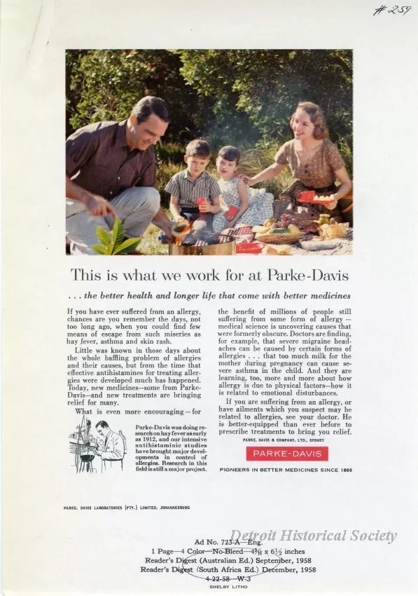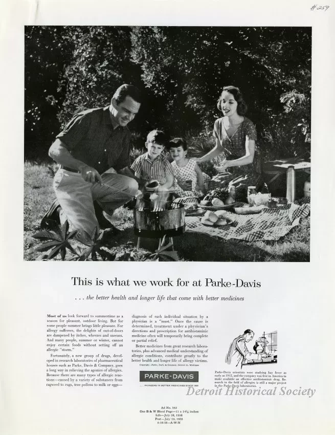 Color and black and white print advertisements for allergy medication produced by Parke-Davis. It depicts a family picnic.