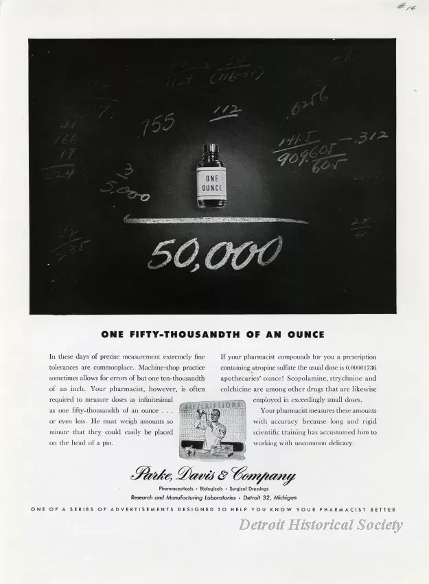 Black and white print advertisements for Parke, Davis & Co. concerning precise measurements in pharmacy. It depicts a one ounce bottle on a chalkboard.