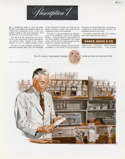 Color print advertisement for Parke, Davis & Co. lauding pharmacists. It depicts a pharmacist reading a prescription, illustrated by J. Crabb.