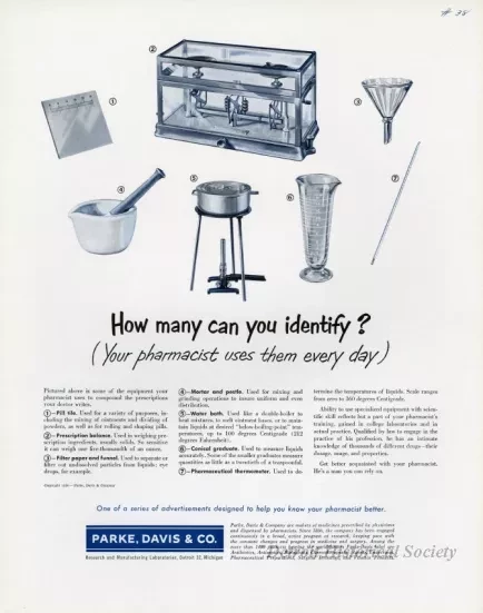 Color print advertisement for Parke, Davis & Co. It depicts seven pieces of equipment used by pharmacists to compound prescription.