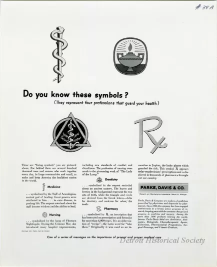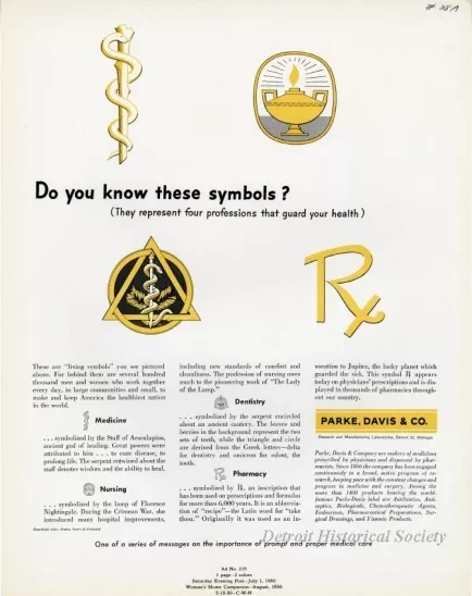 Color print advertisements for Parke, Davis & Co. It depicts the symbols of medicine, nursing, dentistry and pharmacy.