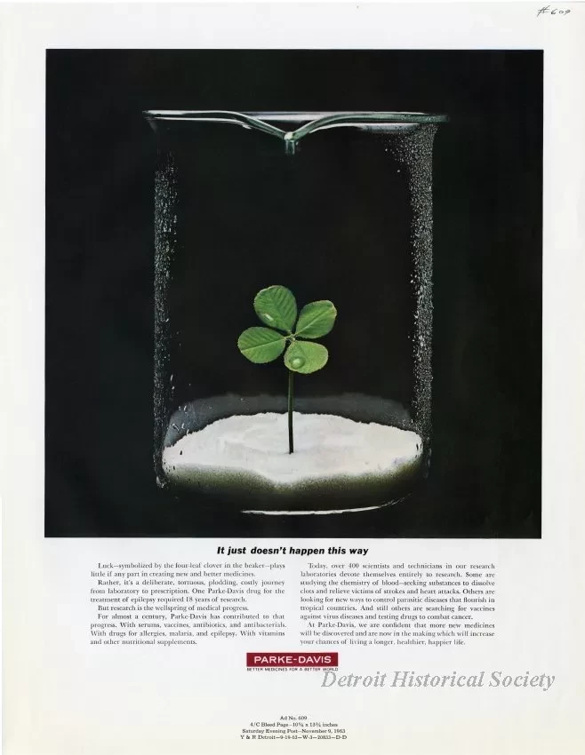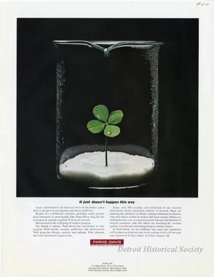 Color print advertisement for the research abilities of Parke-Davis. It depicts a four-leaf clover growing in a beaker.