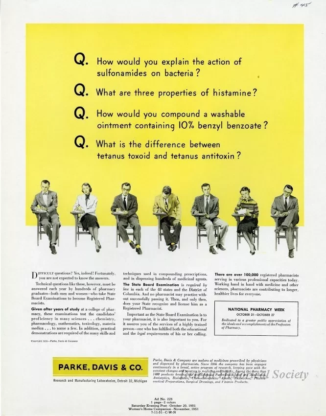 Color print advertisements for Parke, Davis & Co. describing the education of pharmacists. It depicts men and women taking a test, and features three four questions.