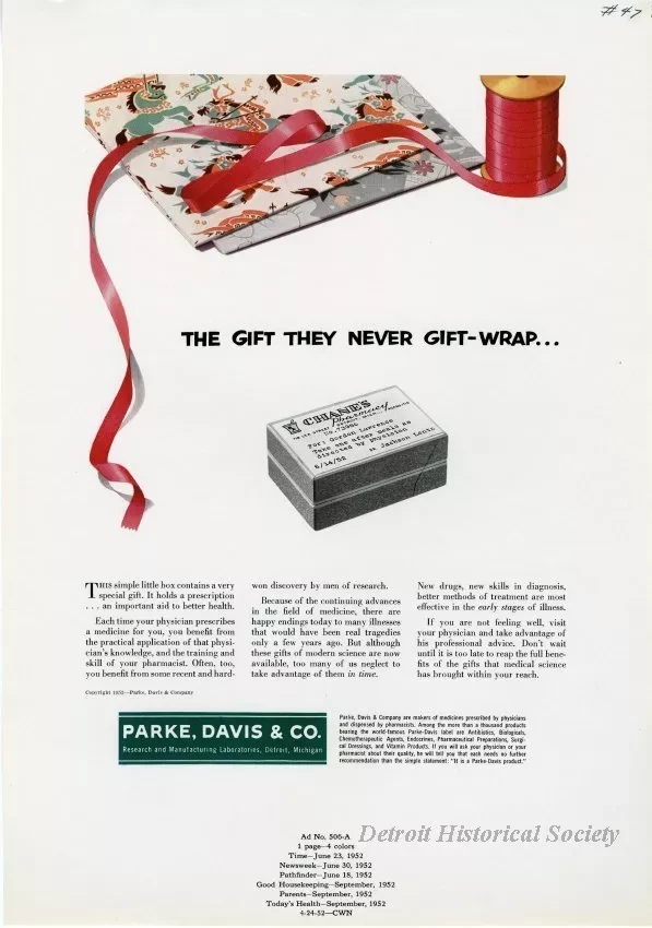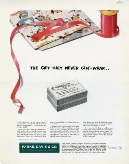Color print advertisements for Parke, Davis & Co. encouraging doctor visits in early stages of illness. It depicts wrapping paper, ribbon, and a prescription package.