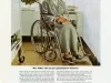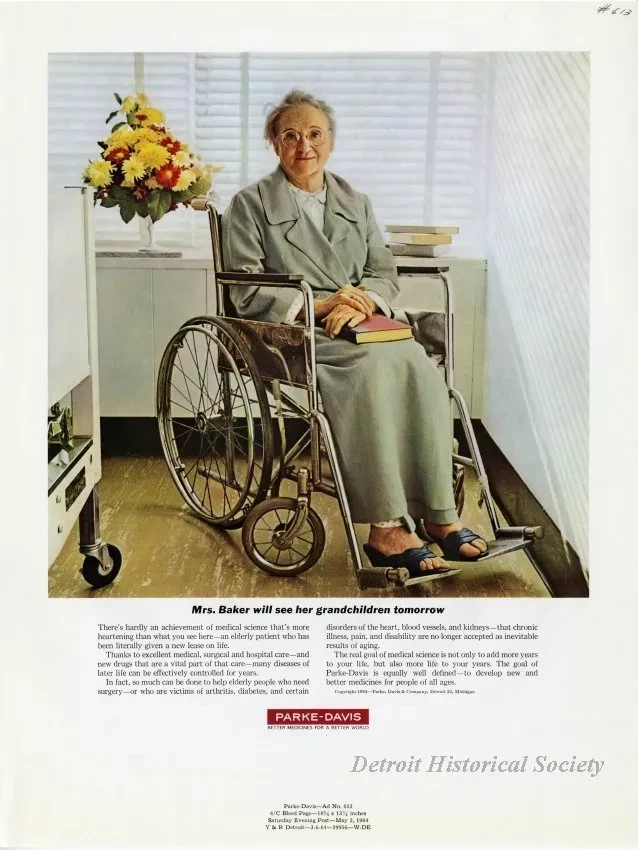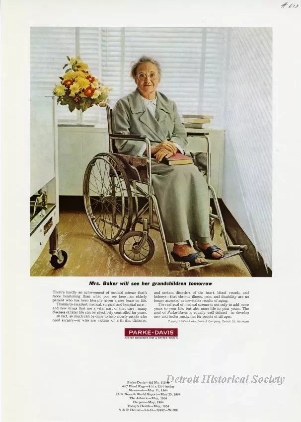 Color print advertisements for Parke-Davis products helping elderly people. It depicts an old woman sitting in an Everest & Jennings wheelchair.